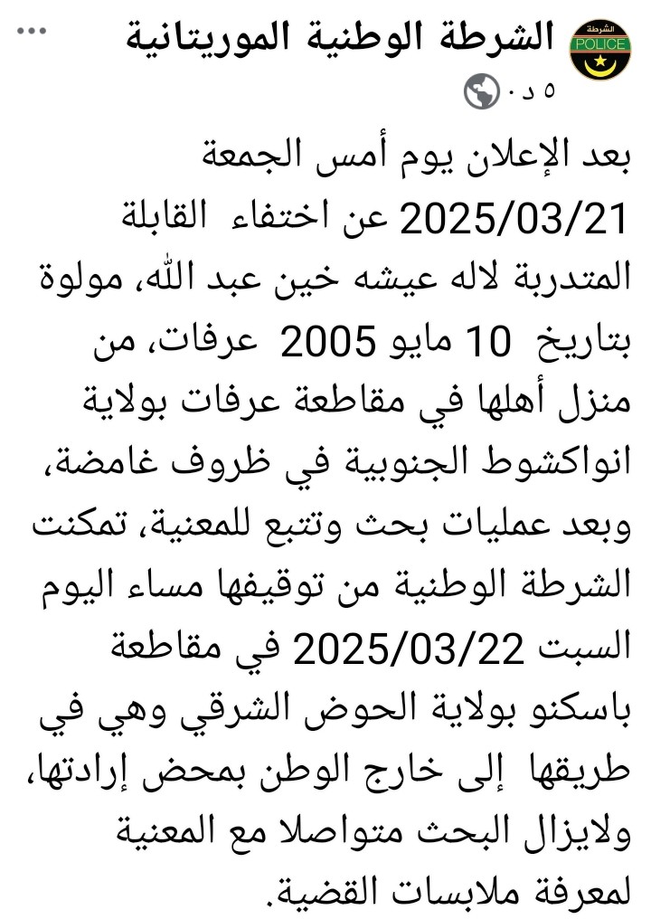 بعد الإعلان يوم أمس الجمعة 2025/03/21 عن اختفاء القابلة المتدربة لاله عيشه خين عبد الله، مولوة بتاريخ 10 مايو 2005 عرفات، من منزل أهلها في مقاطعة عرفات بولاية انواكشوط الجنوبية في ظروف غامضة، وبعد عمليات بحث وتتبع للمعنية، تمكنت الشرطة الوطنية من توقيفها مساء اليوم السبت 2025/03/22 في مقاطعة باسكنو بولاية الحوض الشرقي وهي في طريقها إلى خارج الوطن بمحض إرادتها، ولايزال البحث متواصلا مع المعنية لمعرفة ملابسات القضية.