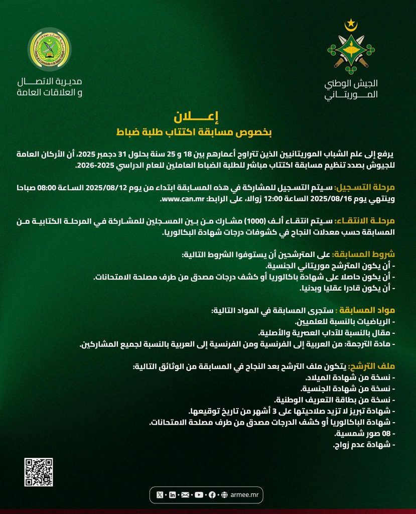 الأخبار ‘الجيش’يعلن عن مسابقة لإكتتاب طلبة “الضباط” edt By 8 أغسطس، 2025 0 يرفع إلي علم الشباب الموريتانيين اللذين تتراوح اعمارهم بين 18و25سنة بحلول 31دجمبر 2025أن لأركان العامه للجيوش بصدد تنظيم مسابقة إكتتاب مباشر لطلبة الضباط للعام الدراسي 2025/2026 شارك هذه المادة