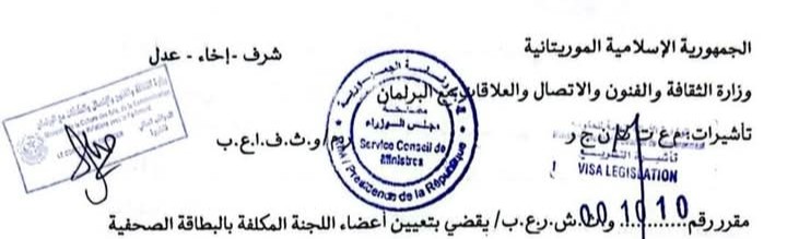 أصدر معالي وزير الثقافة والفنون والاتصال والعلاقات مع البرلمان، الناطق باسم الحكومة الحسين ولد مدو، مقررًا يقضي بتعيين اللجنة المكلفة بالبطاقة الصحفية، في إطار تطبيق أحكام قانون الصحفي المهني.